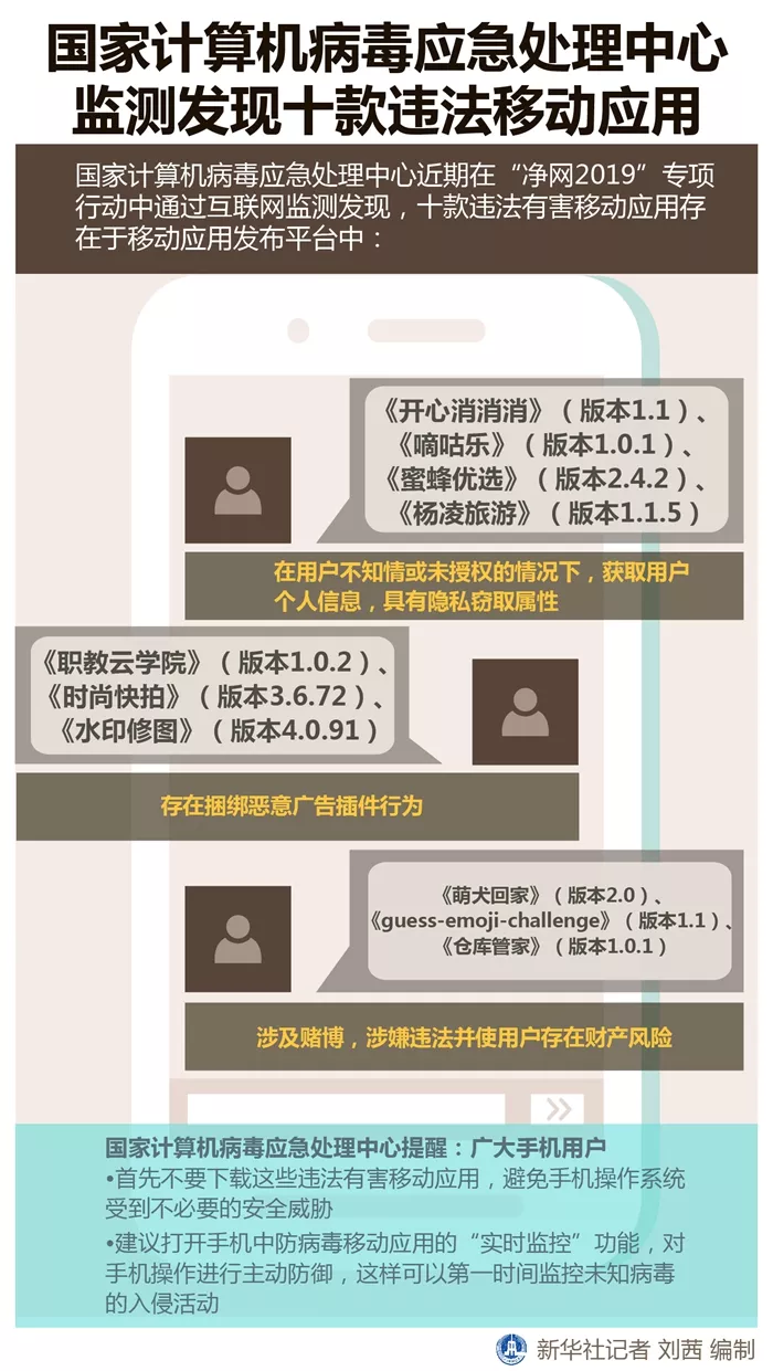 国家计算机病毒应急处理中心近期在“净网2019”专项行动中,通过互联网监测发现,十款违法有害移动应用存在于移动应用发布平台中,其主要危害涉及隐私窃取、私自下载和赌博三类。