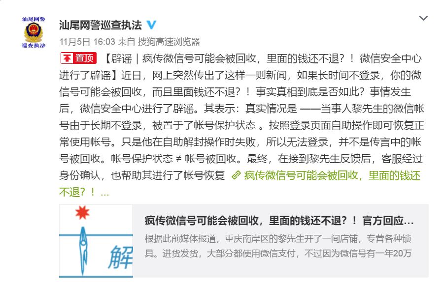 辟谣|疯传微信号可能会被回收,里面的钱还不退?!微信安全中心进行了辟谣!