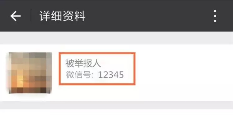 如果发现发布淫秽色情信息的微信号,您也可以向网警巡查执法账号举报,举报时请提供该微信号的号码,最好能够提供相关截图。举个小小的例子,下图中被举报人的微信号就是12345。