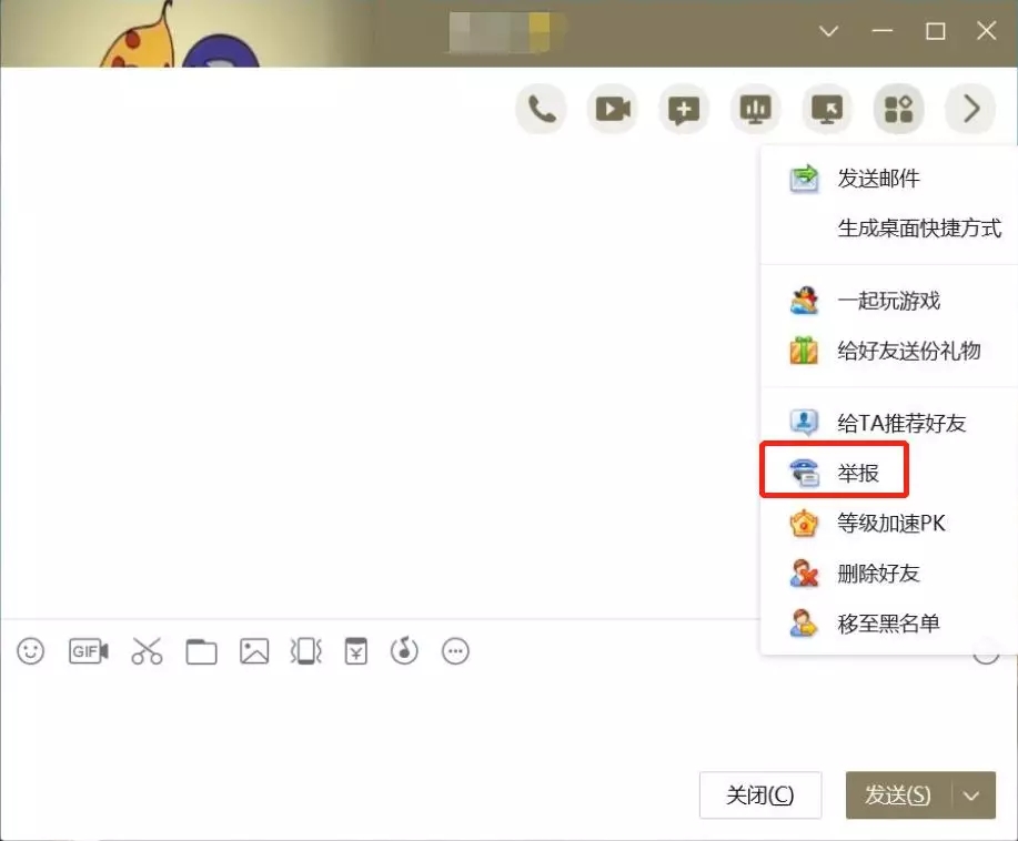 除了向网警巡查执法账号举报之外,您也可直接在QQ对话框页面向腾讯进行举报,如下图所示: