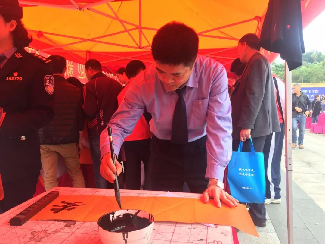 现场有汕尾警营书法爱好者挥墨写春联;展纸,蘸墨,凝神,运笔,笔走龙蛇,挥毫泼墨,一幅幅苍劲有力、喜庆吉祥的春联赠与群众。