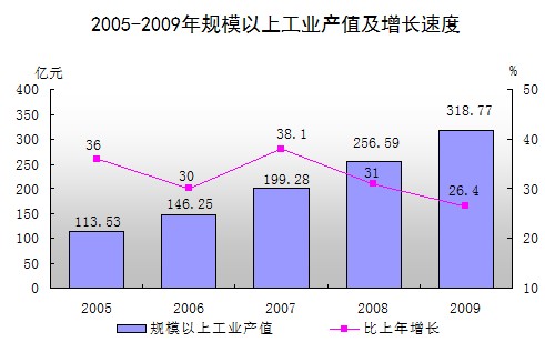 工业结构进一步调整,工业规模化程度提高。2009年全社会工业产值中,规模以上工业所占比重为55%,比上年同期提高5.5个百分点。