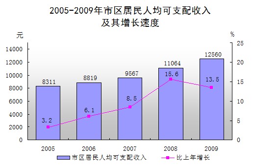 居民收入增加,生活水平稳步提高。据住户抽样调查统计,农民人均纯收入5372元,增长12.2%,人均消费支出3995元,增长2.6%;市区居民人均可支配收入12560元,增长13.5%,人均消费支出8736元,增长6.0%。据劳动工资统计,全市在岗职工工资总额31.85亿元,比上年增长18.0%,在岗职工人均工资23238元,增长14.0%。